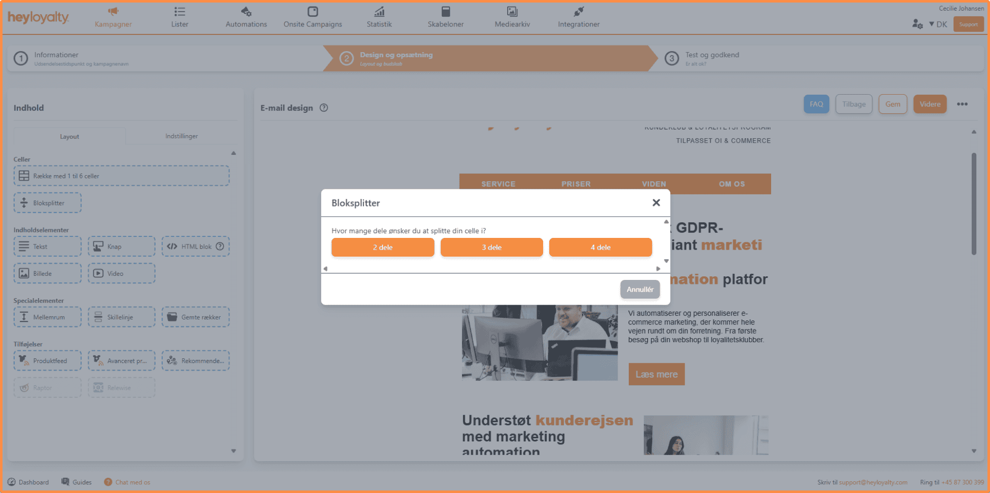 Når rækken er oprettet i din kampagne, vælger du, hvor mange celler den skal deles op i. Her vælger du den celledeling, der passer til det indhold, du vil indsætte.