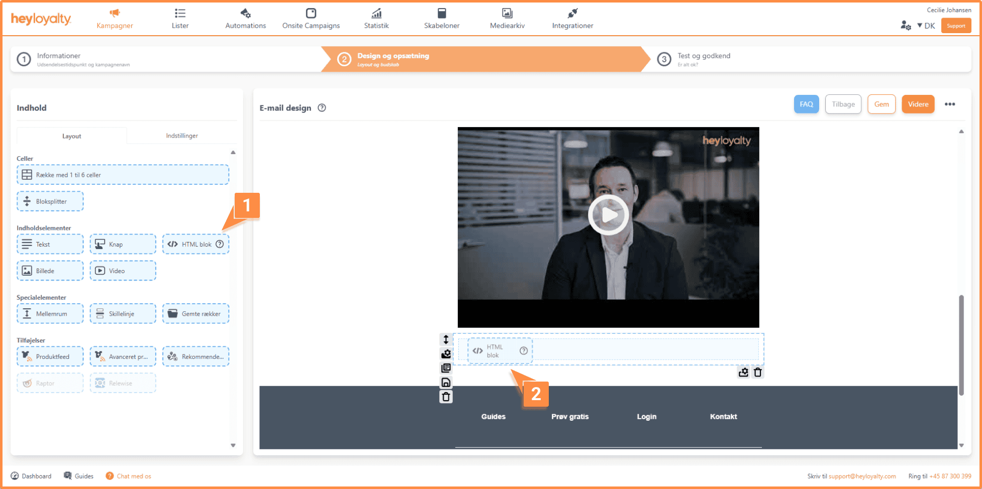 Når du indsætter en HTML-blok, får du mulighed for at tilføje din egen HTML-kode, som derefter vises i kampagnen. Denne blok kan fx bruges til at indsætte interaktive elementer som Google Maps. Vi anbefaler dog kun, at du bruger denne, hvis du har kendskab til HTML: