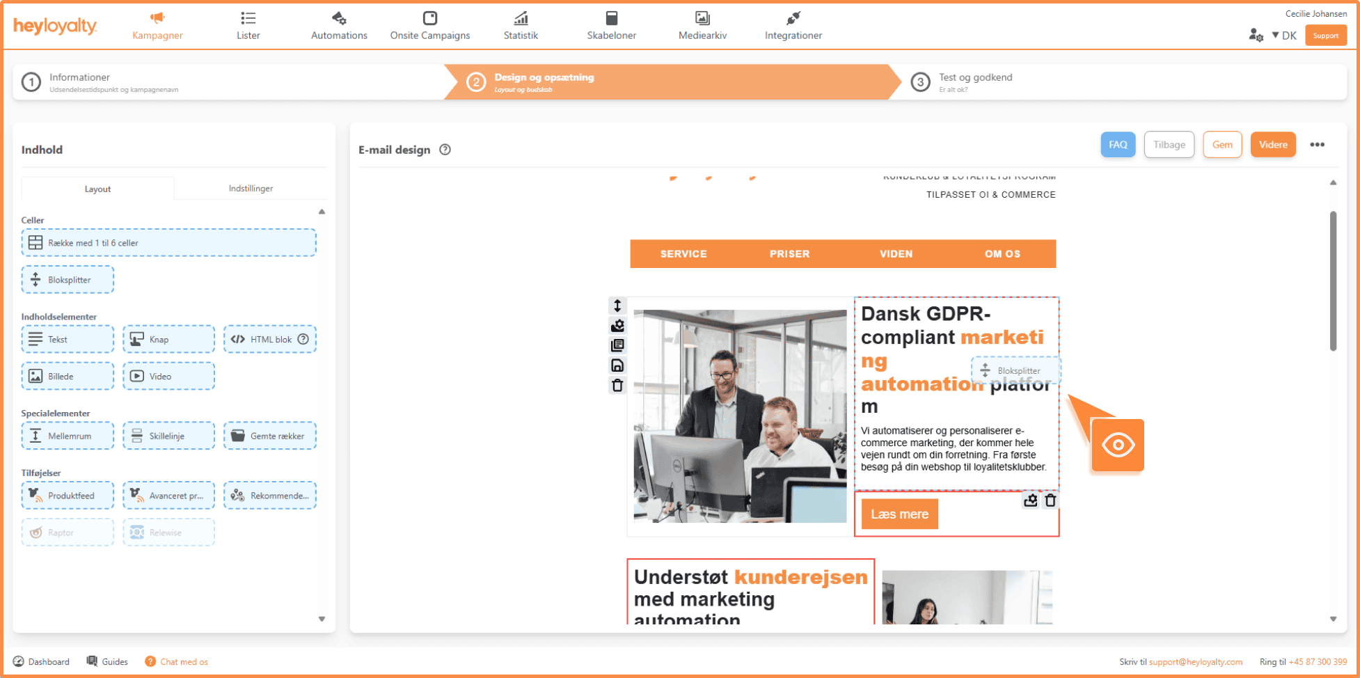 Dette element kan bruges til at indsætte en streg mellem dine rækker, så du kan adskille indholdet i din kampagne. Under indstillingerne kan du tilpasse skillelinjens farve, bredde og længde.