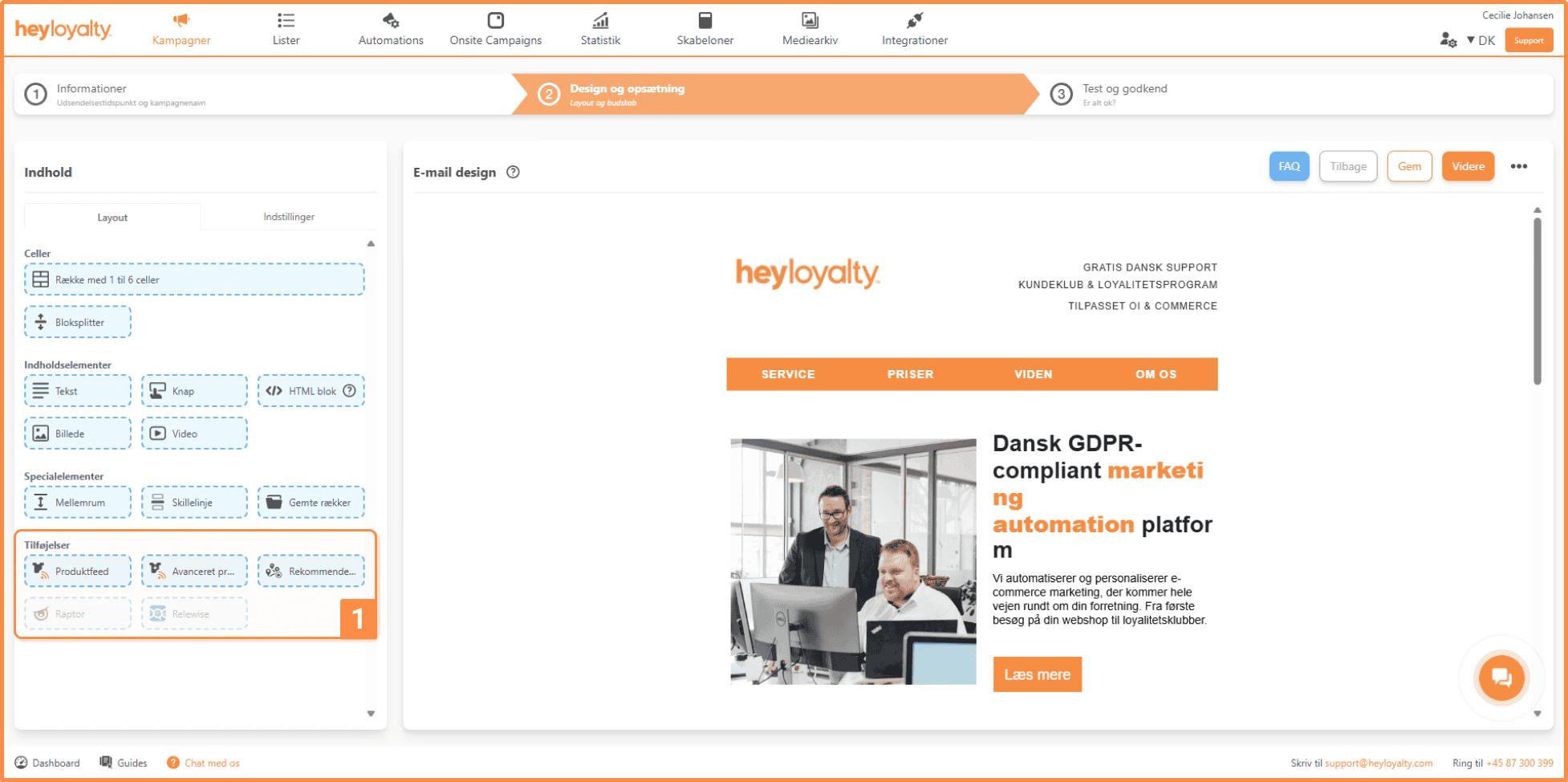 Under Tilføjelser finder du forskellige blokke. Du kan kun bruge de blokke, der er markeret med blå farve. Hvis blokken er grået ud, er det pga. at du ikke har tilkøbt funktionaliteten ved Heyloyalty.