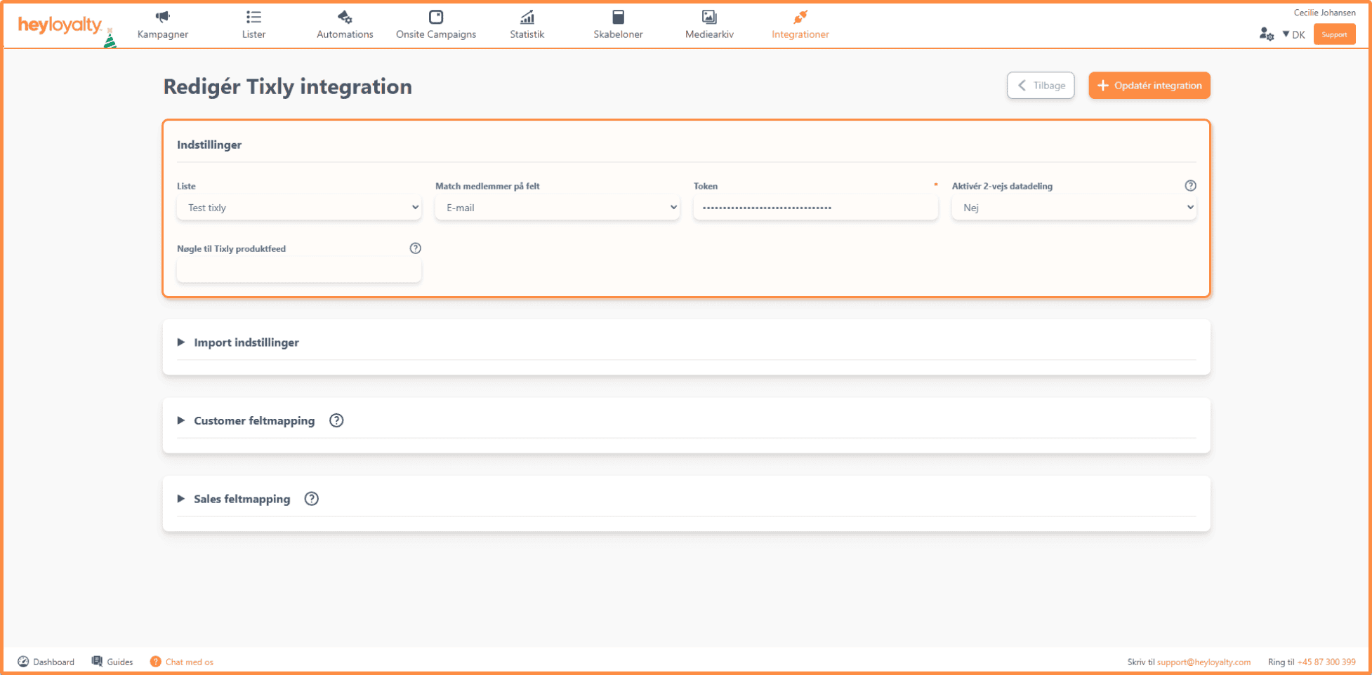 Denne er adgangsgivende til din Tixly løsning*. - Aktivér 2-vejs datadeling: Når du sætter denne til ja, vil kontaktdata og permission på dine kontakter automatisk blive holdt ens mellem Heyloyalty og Tixly. Det vil sige, at ændringer i det ene system overskriver eksisterende oplysninger i det andet system.
