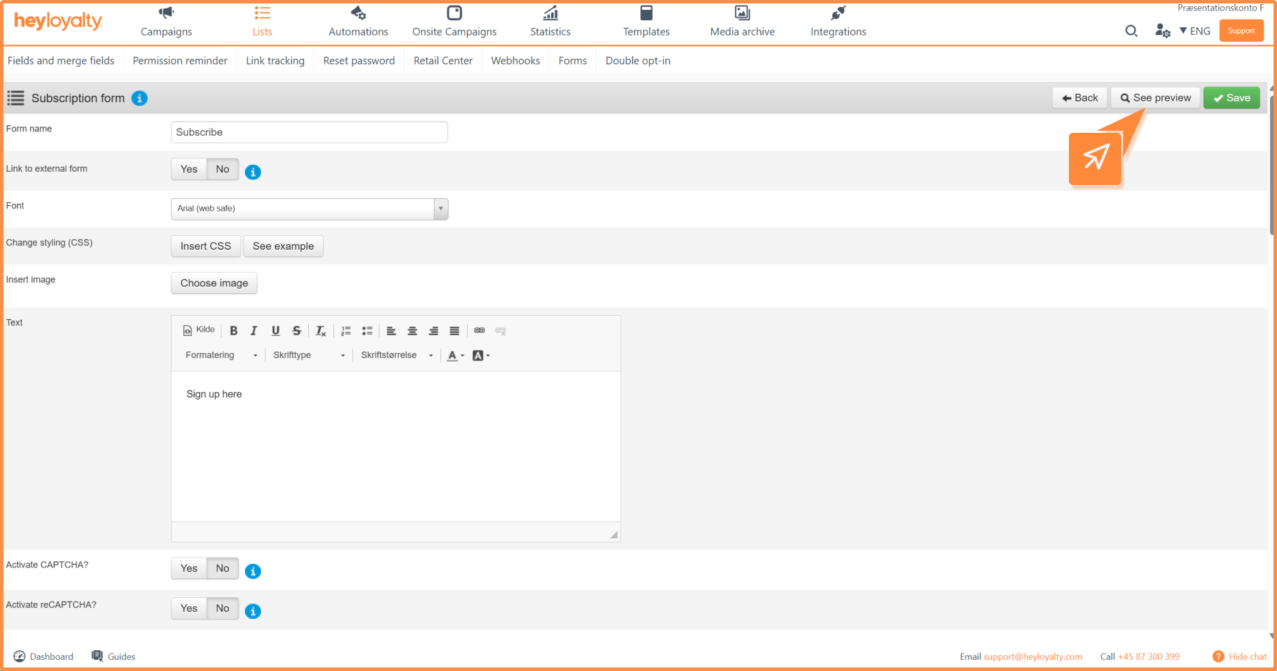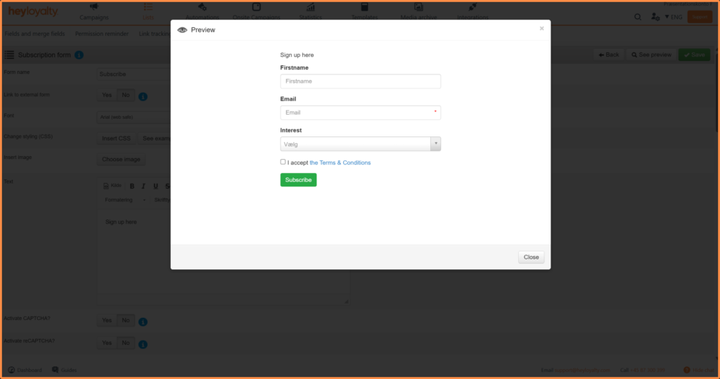 Once you’ve filled in the information and decided which fields should be shown in the form, you can click View preview at the top to see a preview of your form. Click Close and then Save if you are satisfied with your form.