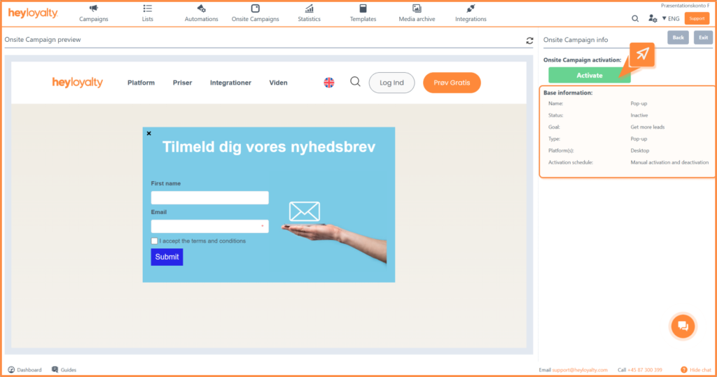 If everything is as it should be, you can just click Activate and your onsite campaign will be live and will be displayed based on the triggers and constraints you selected earlier in the setup.