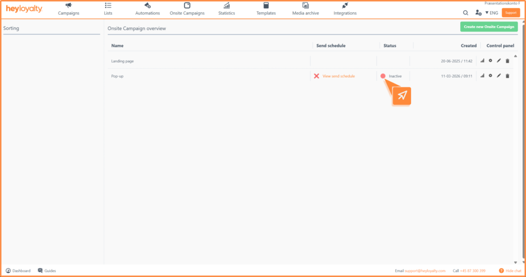 You can activate your onsite campaign by clicking Inactive in the Status column in your Onsite Campaign overview.