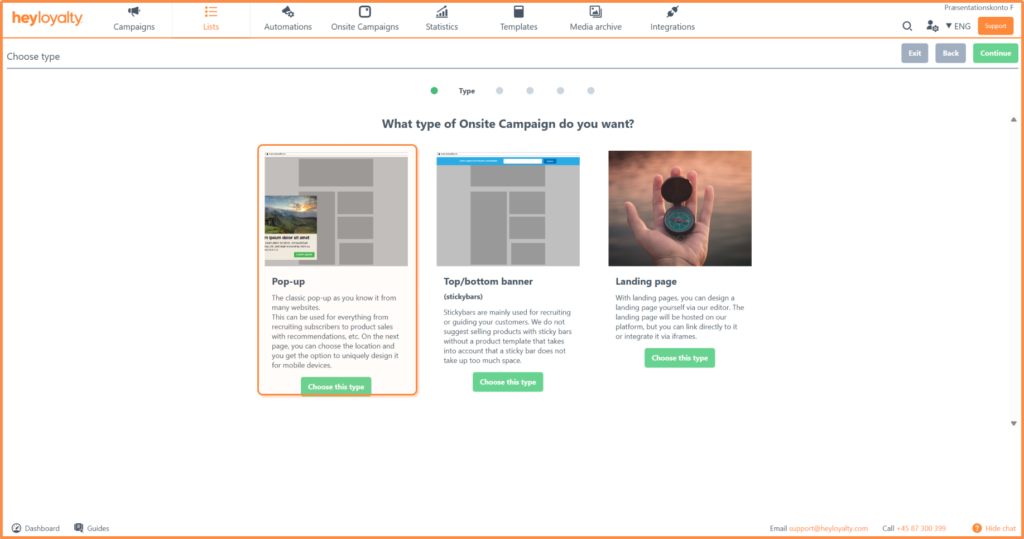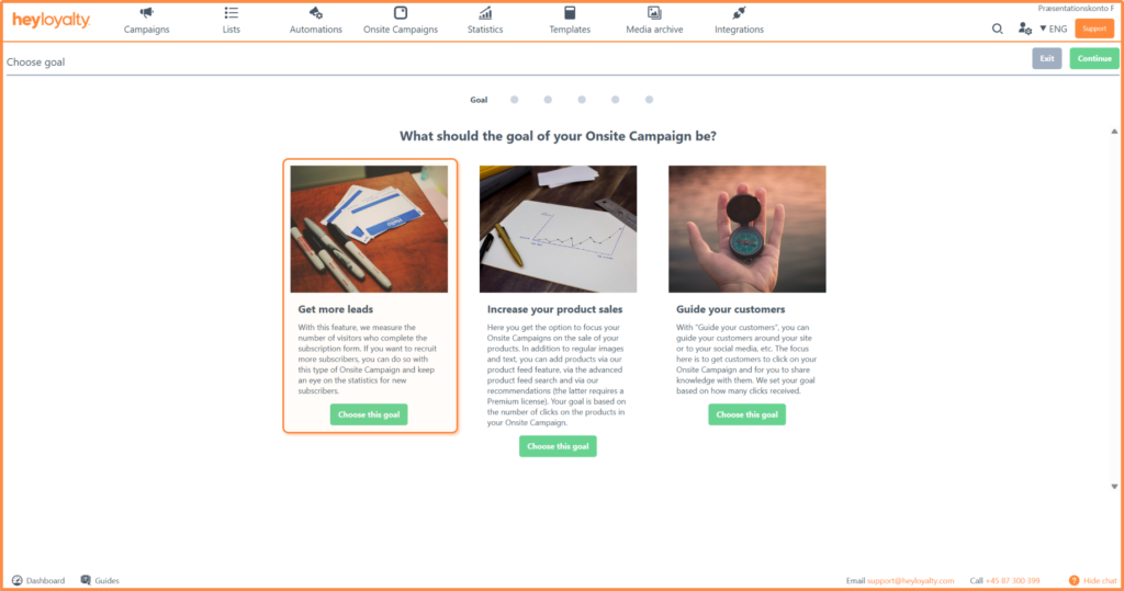 There are several different types of onsite campaigns. In this guide, we focus exclusively on Get more contacts, so you should choose this goal, and then the obvious choice is pop-up; Choose this type.