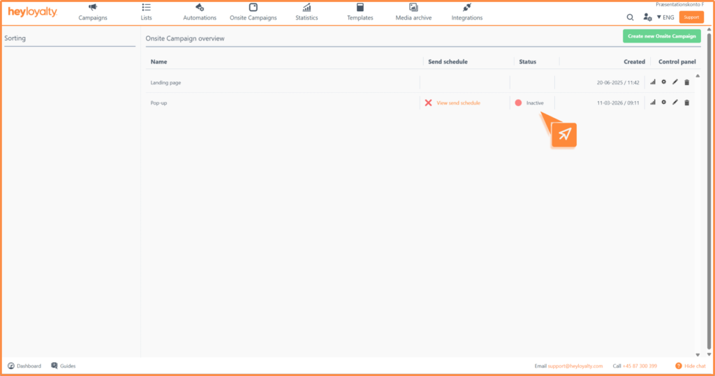 You can activate your onsite campaign by tapping Inactive in the Status column of your Onsite Campaign overview.