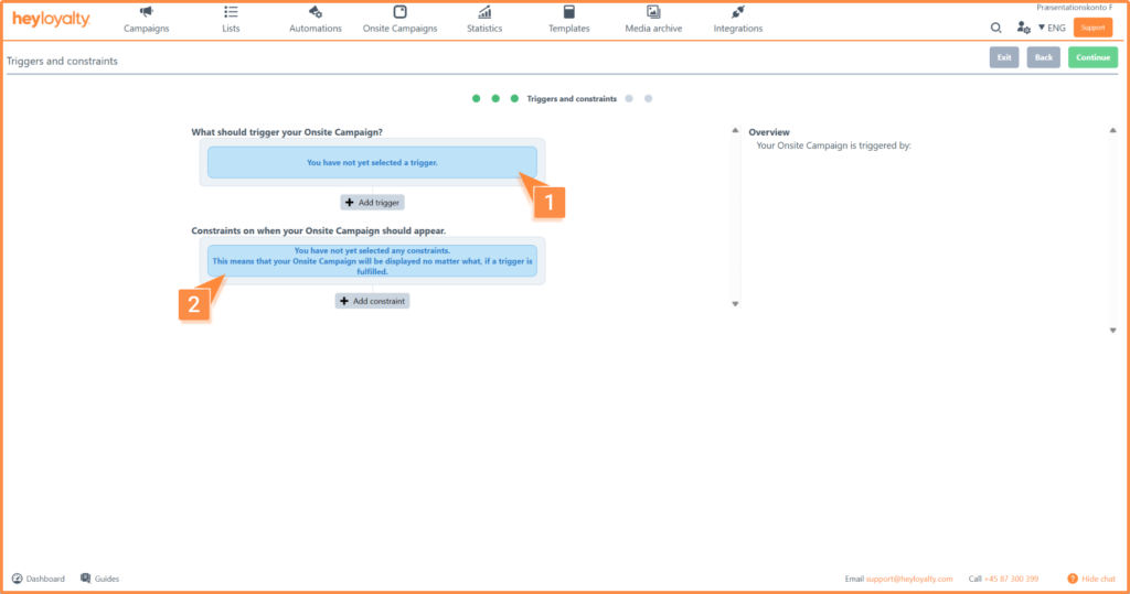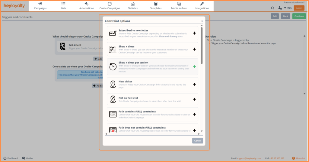 Choose from the various triggers and constraints that control who, when, and why a guest should see this onsite campaign.