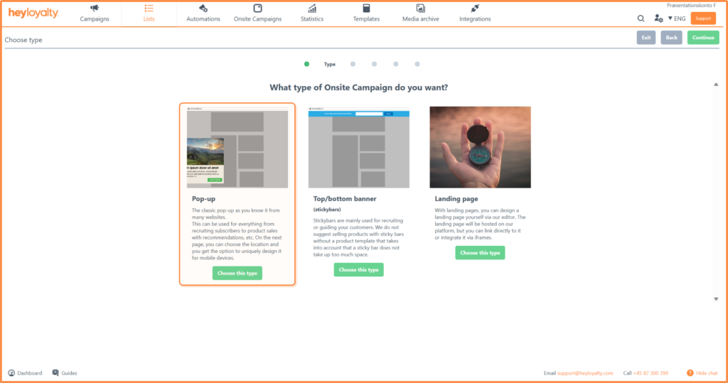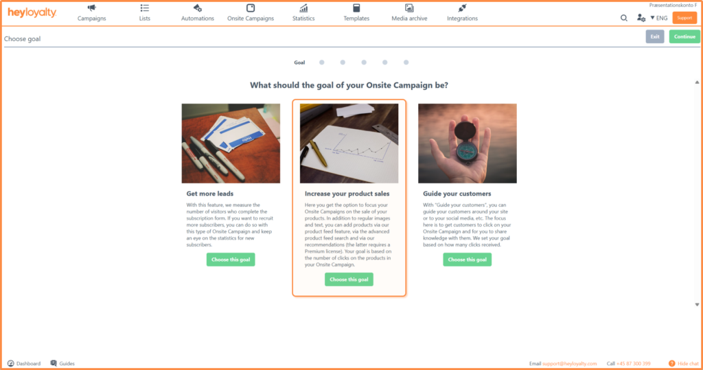 There are several different types of onsite campaigns. In this guide, the focus is solely on Increase your product sales, why you should choose this goal and subsequently the obvious choice is pop up; Select this type.