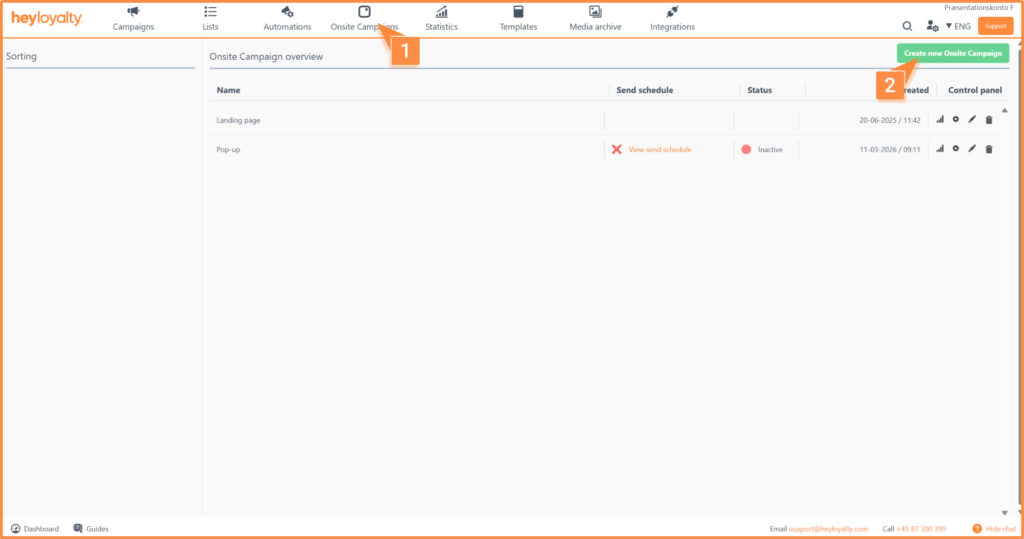 Setup your onsite campaign by clicking on Onsite Campaigns –> Create new Onsite Campaign.