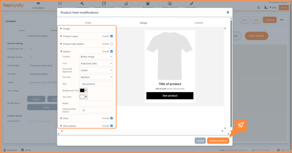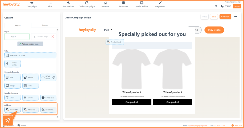 If you have a product feed in your account, you can use the product feed to pull products into your onsite campaign – just like you know it from your email campaigns and automations.
