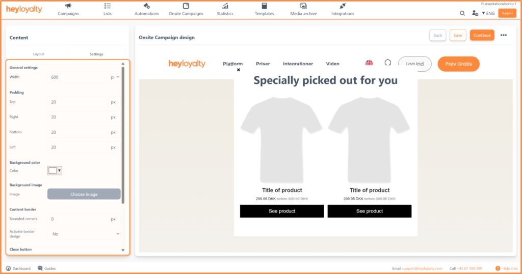 When you are happy with the design, click Continue, where you can see a preview of your onsite campaign on your site and a summary of your settings for that onsite campaign.