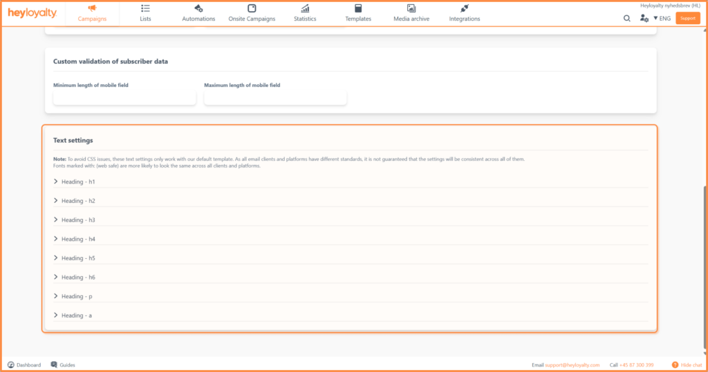The 8 different text types in the editor, when you design campaigns and automations, can be managed here. However, it only works with Heyloyalty’s standard template.